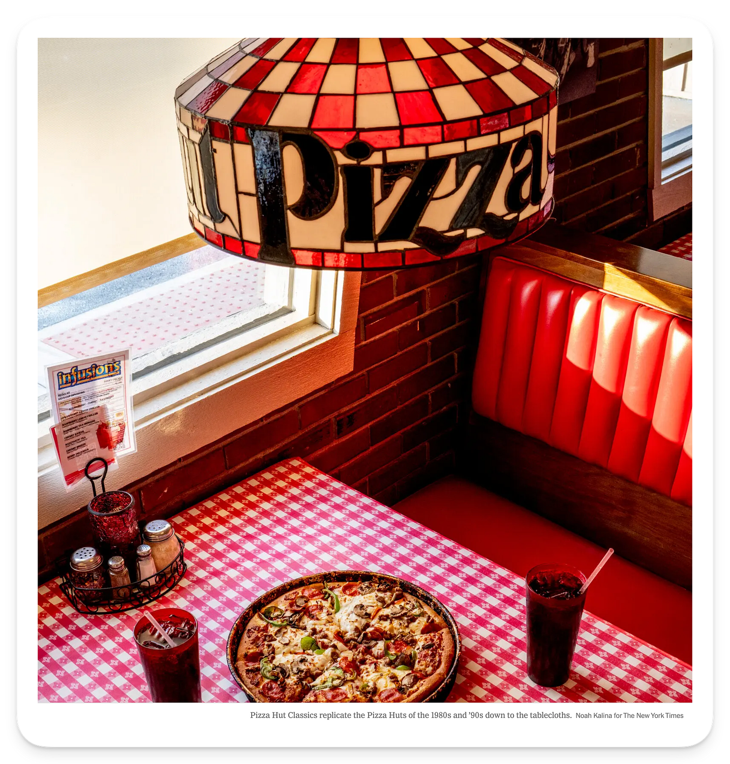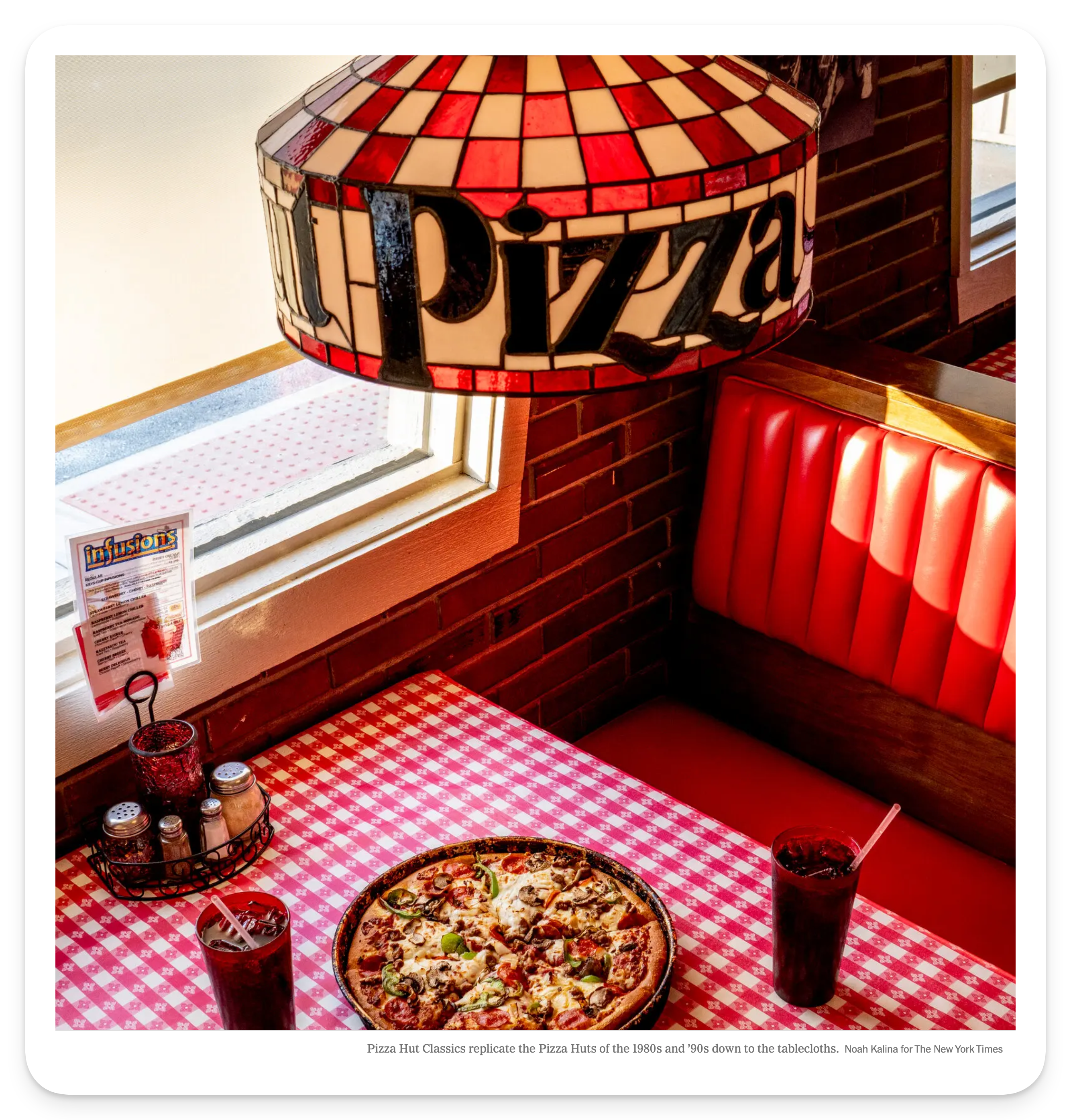 He had not discovered an abandoned relic from the Reagan era. As a plaque near the door explained, this restaurant in Tunkhannock, Pa., was a Pizza Hut Classic. The interior design and menu had been painstakingly engineered to replicate the Pizza Huts of the 1980s and ’90s, when families and friends settled into red-vinyl booths on a Friday night to eat deep-dish pan pizza and drink Pepsi from red plastic cups.