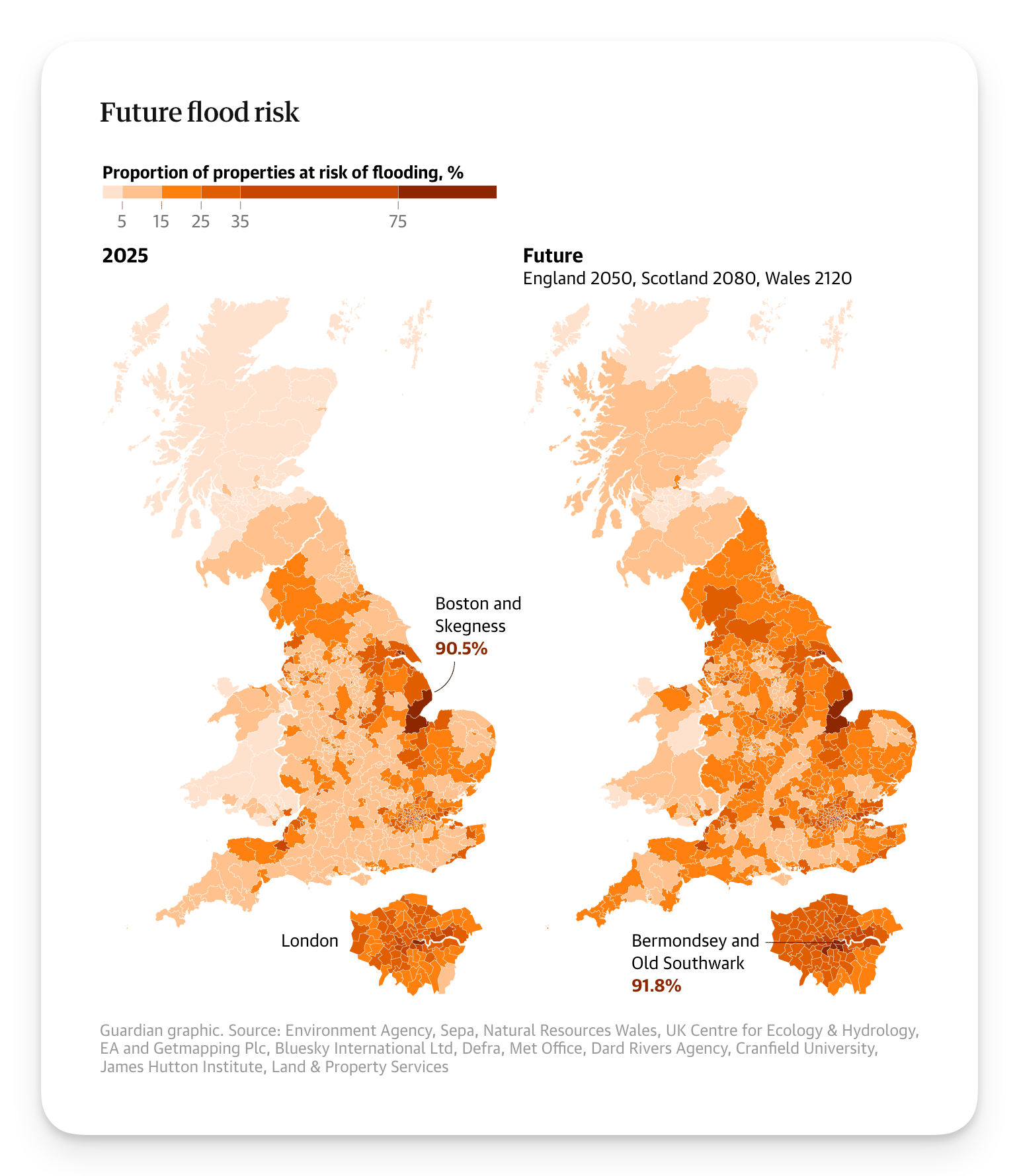 Millions more homes in England, Scotland and Wales face devastating floods, and some towns may have to be abandoned as climate breakdown makes many areas uninsurable, a Guardian investigation has found.