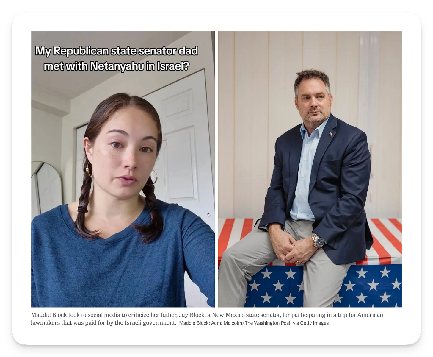 “It looks like my dad and a bunch of other, just like, loser politicians from New Mexico went to meet with Netanyahu,” Ms. Block said in a video that has been viewed more than 1.8 million times and gained national media attention.