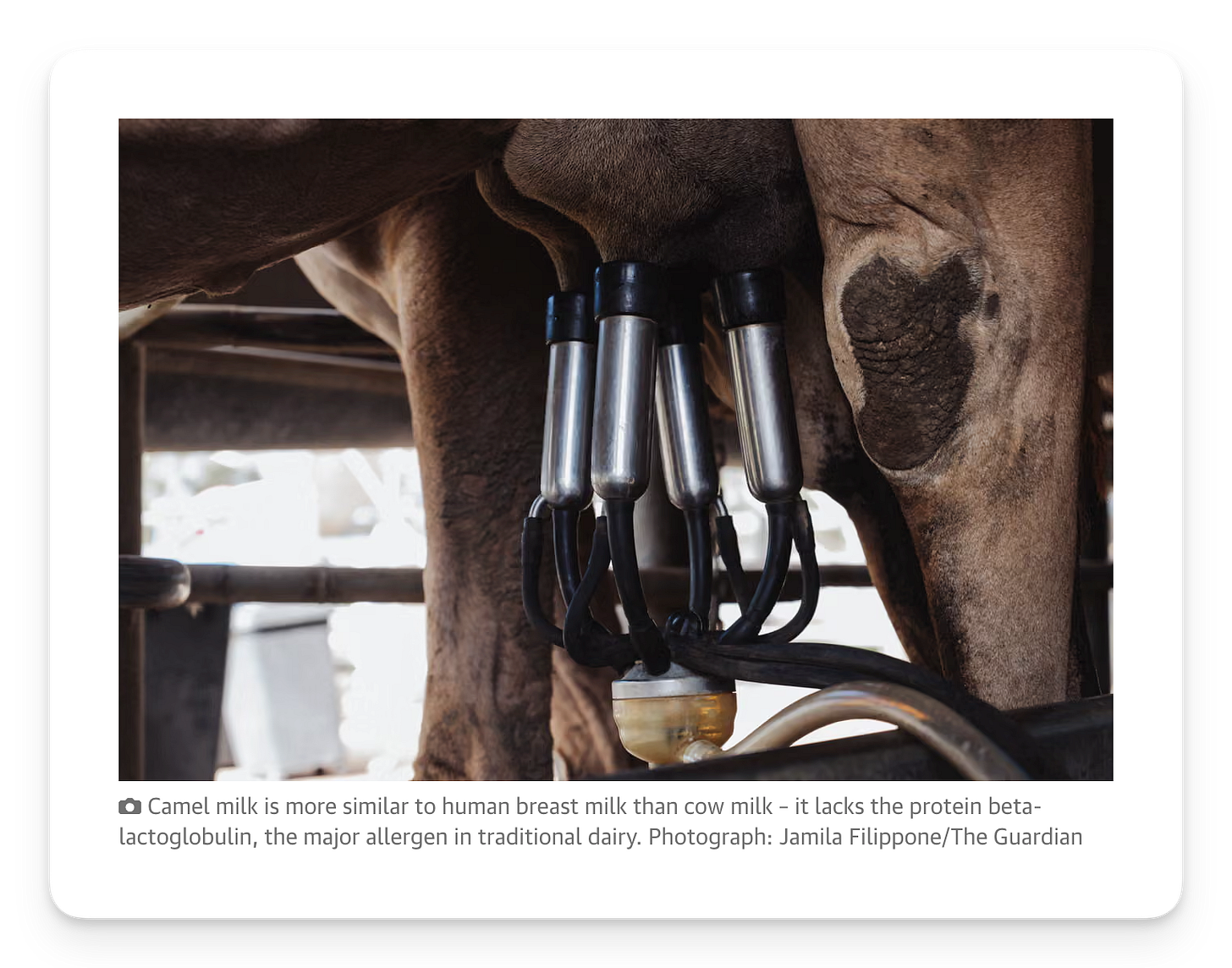 Behind Caroline is Mildred, the second in a line of 10 in this open-air dairy shed, an hour’s drive from the metropolis of Brisbane and thousands of kilometres from Australia’s arid heart. Instead of red dunes and vast spinifex plains, these camels are surrounded by lush pasture and a horizon of jagged and wooded peaks.
